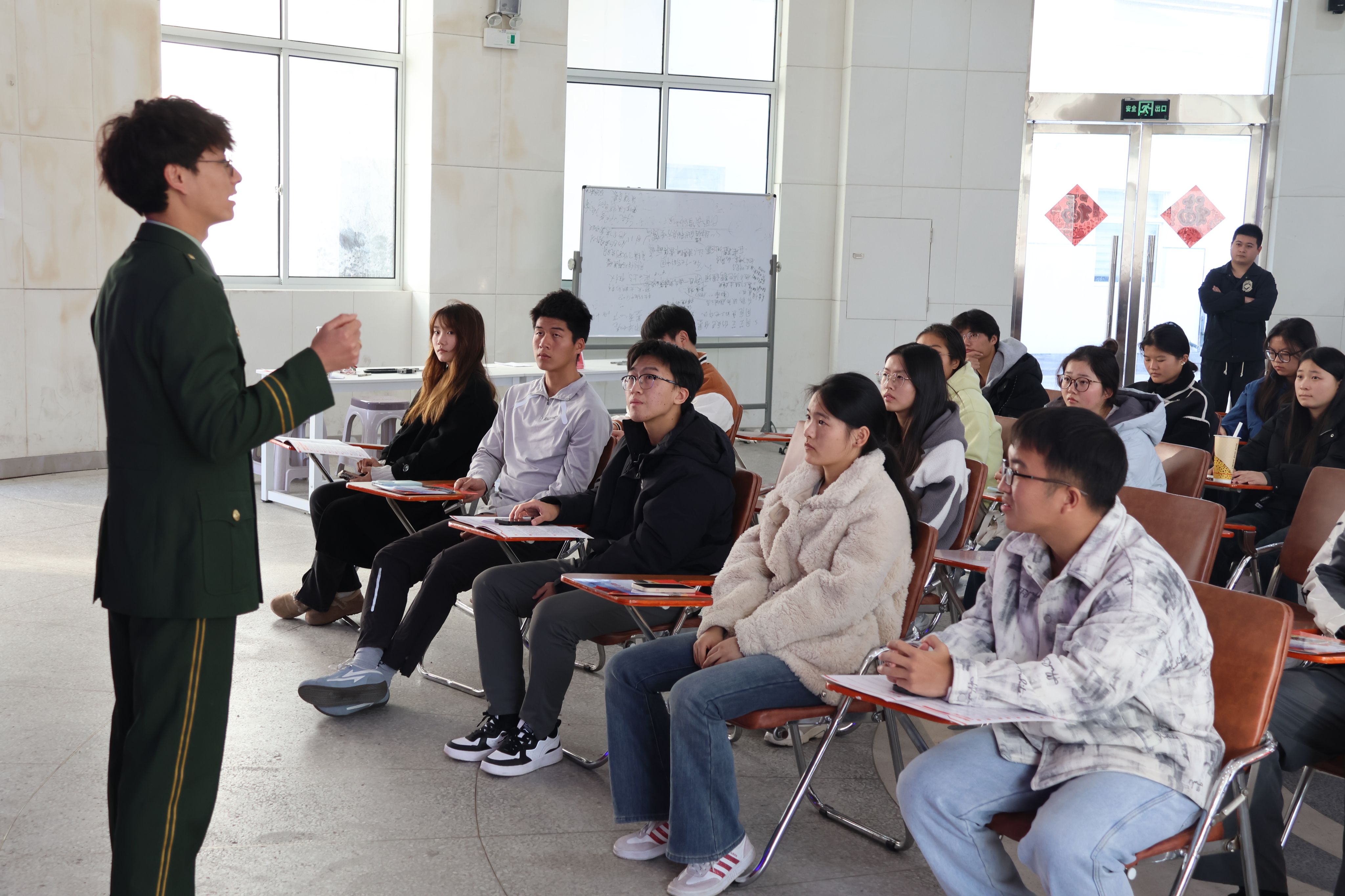 活动中,迷彩青春社的退伍老兵代表陈克祥,结合自身军旅经历,用真挚语言和鲜活事例,分享保家卫国的热血瞬间、军营成长蜕变与退役后的责任坚守。学校征兵宣传大使代表王庆欢,围绕入伍流程、征集条件、优待政策、军营发展前景等核心内容详细解读,从报名渠道、体检标准到学费补偿、就业扶持,用通俗语言为大家逐项说明。