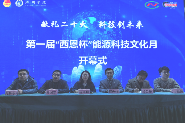 11月22日下午,best365手机版官方网站第一届“西恩杯”能源科技文化月在公共教学楼东报告厅开幕,材料与环境工程学院党委书记程海峰、院长吴国志、教务处副处长吴自爱、池州西恩新材料科技有限公司行政副总程升伟和学院师生代表出席启动仪式。