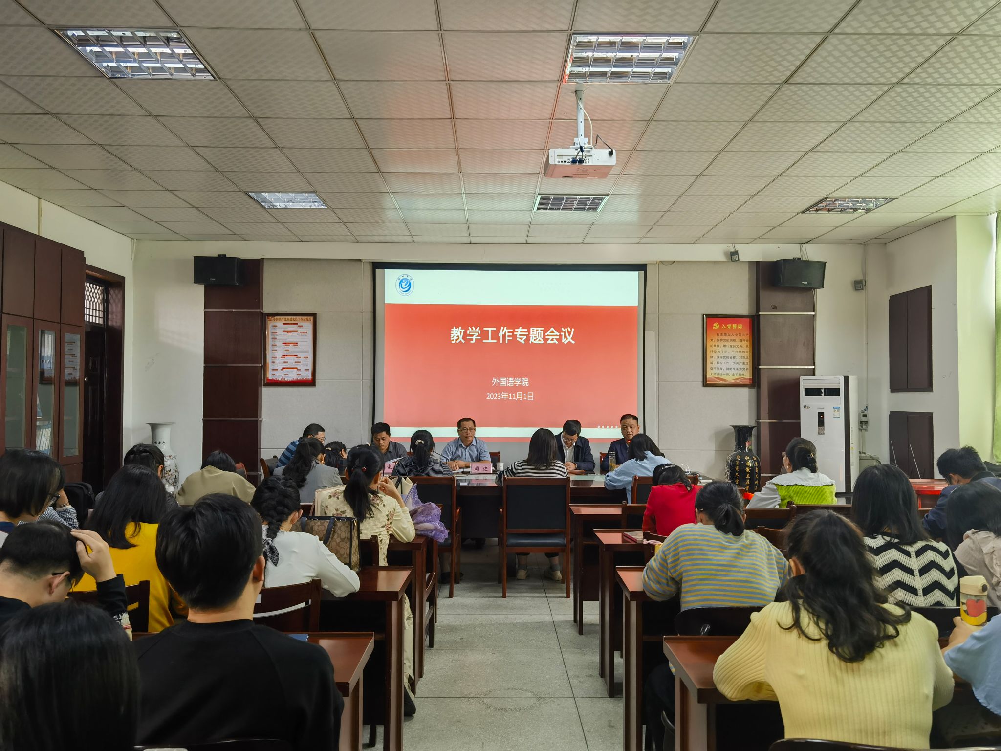 11月1日,外国语学院在院会议室举行教学工作专题会议,教务处副处长周恺、教务科科长王家成应邀参加会议。会议由外国语学院院长余义兵主持。