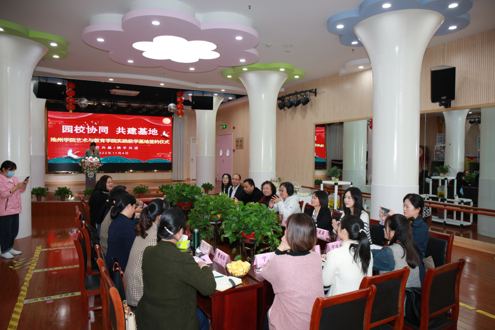 为贯彻落实党的二十大精神,加快建设高质量幼教体系,建立合作共赢的“三位一体”协同培养机制,进一步提升高素质应用型人才培养质量,11月4日下午,艺术与教育学院与青阳县直属机关幼儿园、东至县直属机关幼儿园、石台县示范幼儿园等六所幼儿园在贵池区启蒙树幼儿园举行了实践教学基地签约暨授牌仪式。池州市教体局机关工会主席武慧、青阳县教体局幼教教研员徐永丽,副院长曾晓红、实验实训中心主任余维君、学前教研室主任谭甲文、学前教育专业老师张俊、付晨晨等参加了此次仪式。