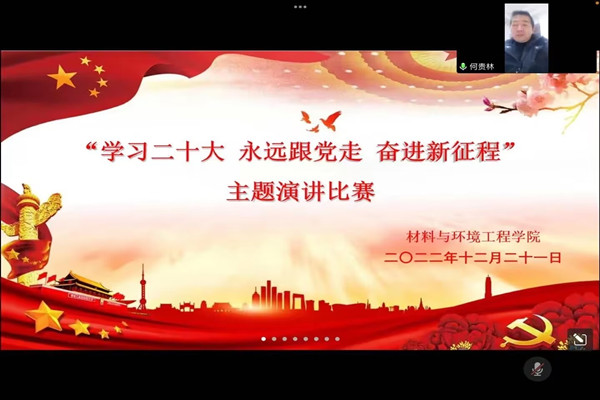 为深入学习贯彻党的二十大精神,激励青年学子在新时代奋发图强,彰显青春担当,12月21日,材料与环境工程学院举办“学习二十大 永远跟党走 奋进新征程”线上主题演讲比赛。院党委书记何贵林、党委副书记刘昉、团委书记关旋、学工办副主任魏晓娇等老师莅临此次线上活动,学院200余名同学观摩了比赛。