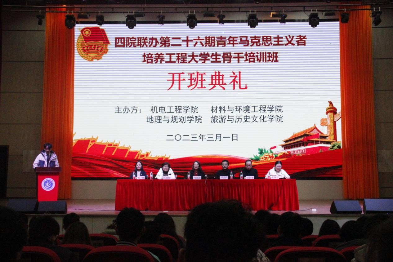 为深入学习贯彻习近平新时代中国特色社会主义思想和党的二十大精神,认真贯彻落实习近平总书记关于青年工作的重要思想,加强对青大学年生的思想政治引领,地理与规划学院、机电工程学院、材料与环境工程学院和旅游与历史文化学院于2023年3月1日晚在博古礼堂联合举办了第二十六期青年马克思主义者培养工程培训班,校团委书记程海峰、地理与规划学院党委负责人许卫兵、机电工程学院党委负责人冯淑慧、旅游与历史文化学院党委副书记杨祖勇、材料与环境工程学院党委副书记刘昉应邀出席开班仪式。