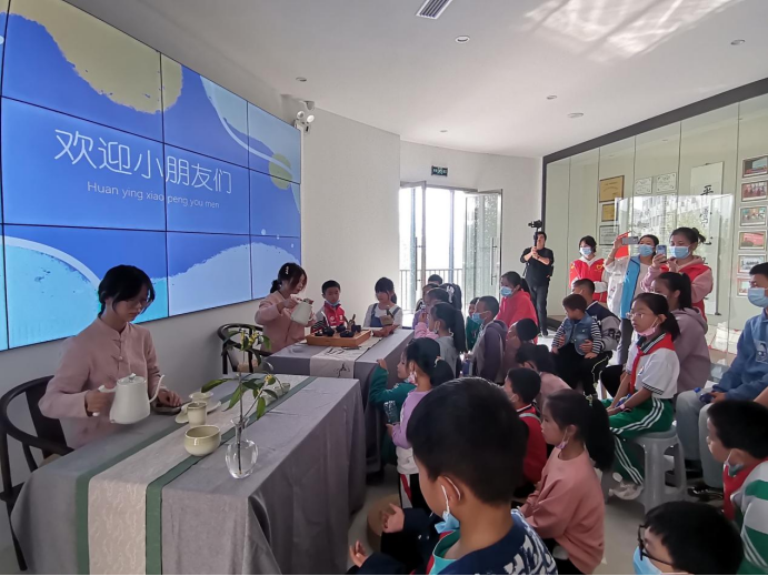 第二站为茶艺社。在这里,儿童观看了茶艺社成员带来的茶艺表演,他们对茶艺社成员行云流水的演示感到震惊。小朋友们说,自己从未见过有人这样泡茶,这次来让自己学习到了一些茶文化知识,感受到传统文化的力量。
