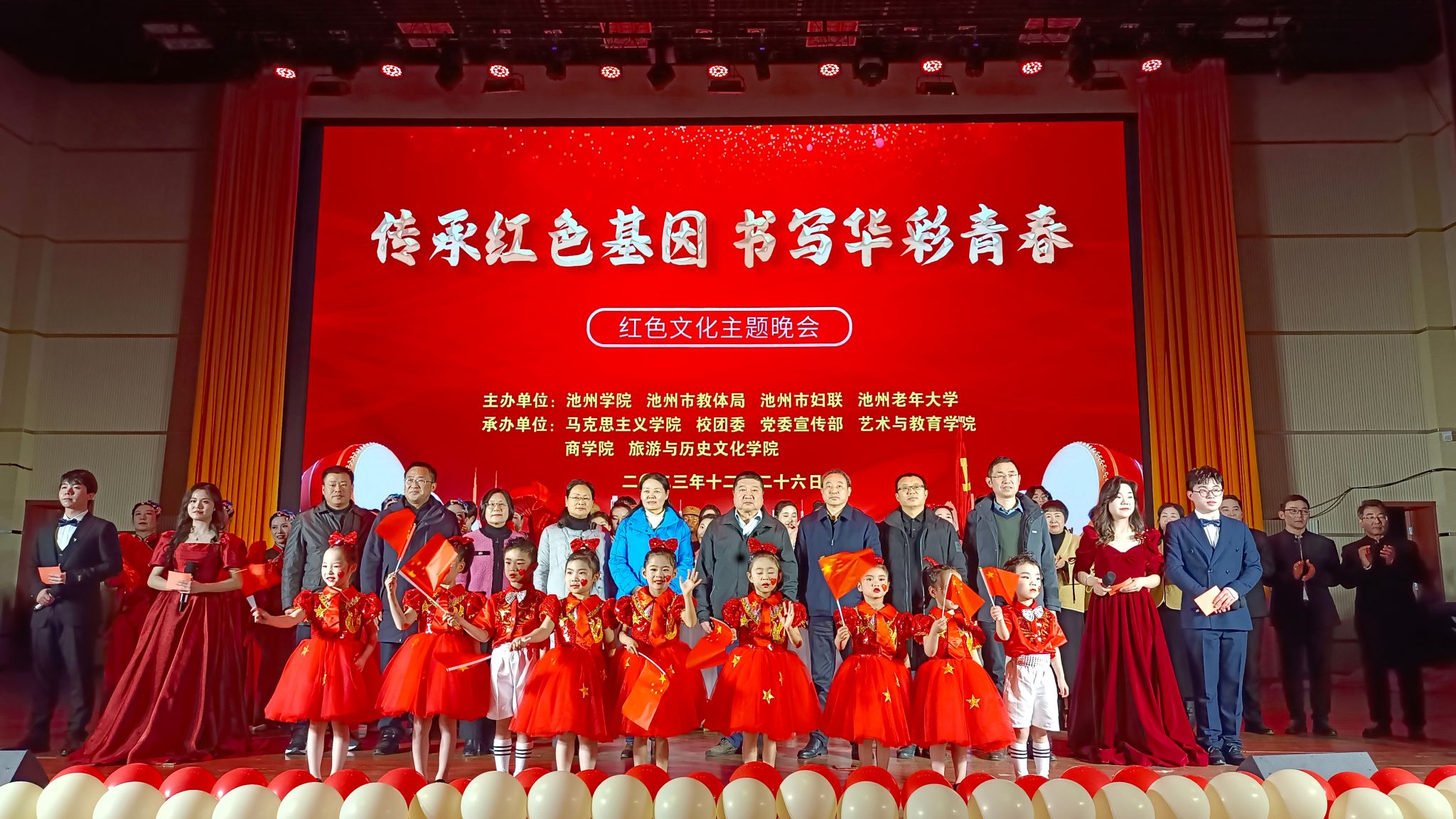 为纪念毛泽东同志诞辰130周年,深入学习贯彻习近平文化思想,引导广大青年厚植家国情怀、涵养进取品格,12月26日晚,学校在博古礼堂举办“传承红色基因 书写华彩青春”红色文化主题晚会。池州市人大常委会原主任施建华,党委副书记、院长郑兰荣,党委委员、纪委书记、巡察专员汪海,党委委员、副院长吕刚、张赛,职能部门主要负责同志、二级学院主要负责同志,以及思政课教师、政治辅导员和学生代表共500余人齐聚一堂观看了晚会。