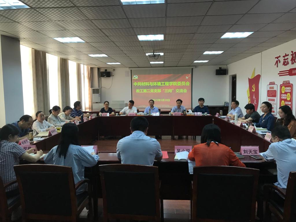 为深入开展学习贯彻习近平新时代中国特色社会主义思想主题教育,5月18日下午,材料与环境工程学院教工第二党支部在逸夫楼南三楼会议室召开“三问”交流会。校党委副书记崔国发,省委第十二巡回指导组赵长河、夏明阳,党委委员、组织部长胡兵到会指导。