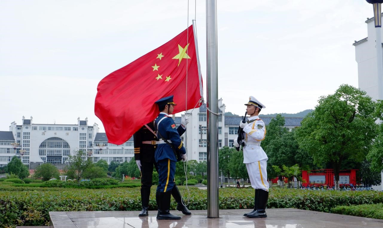 上午7:00升旗仪式正式开始,伴着庄严的国歌,鲜艳的五星红旗迎着初升的朝阳冉冉升起,全体成员庄重肃立,面向国旗行注目礼。